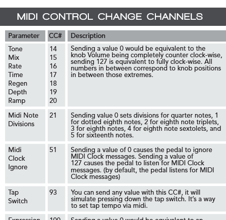 Example: the Chase Bliss Tonal Recall delay pedal accepts values of 0-127 on CC#17 to address the Time knob. Sending a value of 0 to CC#17 on the TR's channel will set the pedal's delay time to the shortest possible; sending 127 to CC#17 will set the time to the maximum possible delay time.