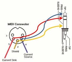 A 5-pin MIDI receptacle is usually way too big to fit on a a guitar pedal. Because MIDI only uses 3 of the 5 pins, that means that MIDI data can also be transmitted on a simple headphone-style Tip-Ring-Sleeve (TRS) cable in either 1/8" or 1/4" sizes.
