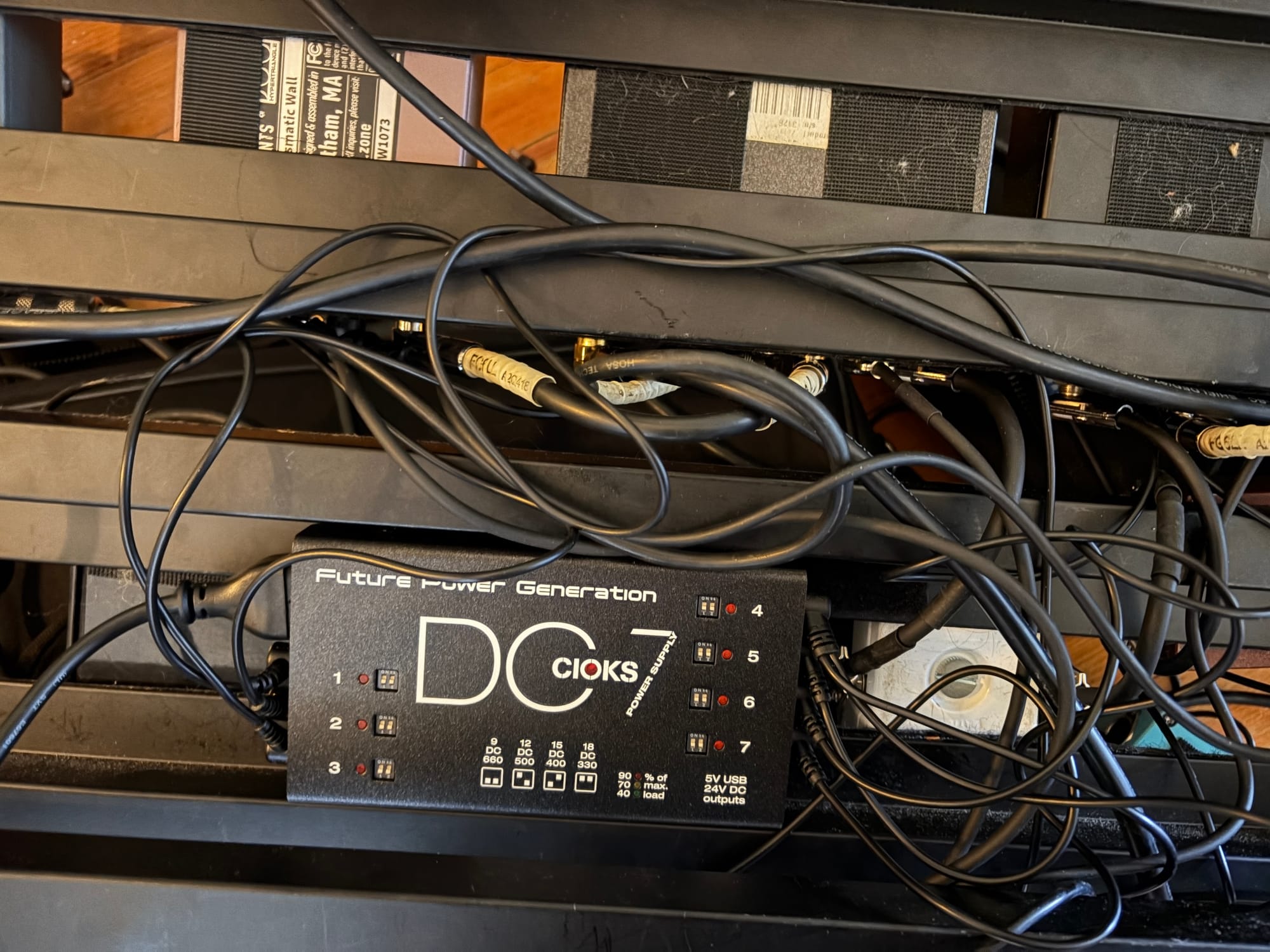 The DC7 has seven configurable outputs, each rated for 6W of power (660mA at 9V, each outlet can be stepped to 12V,15V,18V for pedals that need it). There's a USB out for powering an iPad or my MIDIHub or whatever else I might want. Downsides: Cioks has a vaguely proprietary cabling setup, using RCA-male-to-2.1mm barrel male, so all of my existing pedal power cables are useless.